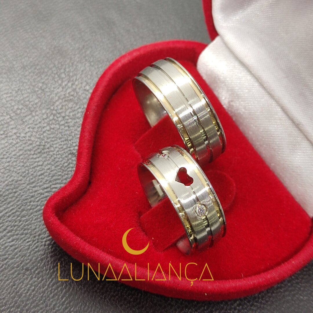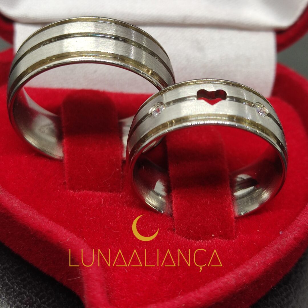 Seja o primeiro a avaliar “Aliança coração vazado com 2 filetes de ouro abaulada aço inox 8.0mm”